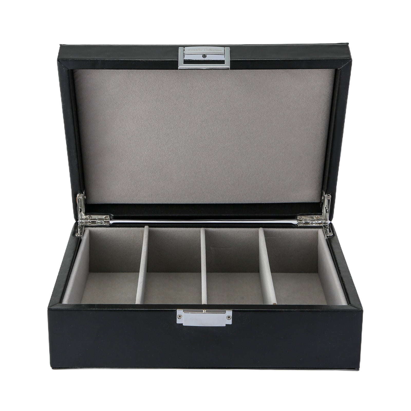 De sieradendoos is gemaakt van zwart imitatatieleer en een zachte grijskleurige velours voering.