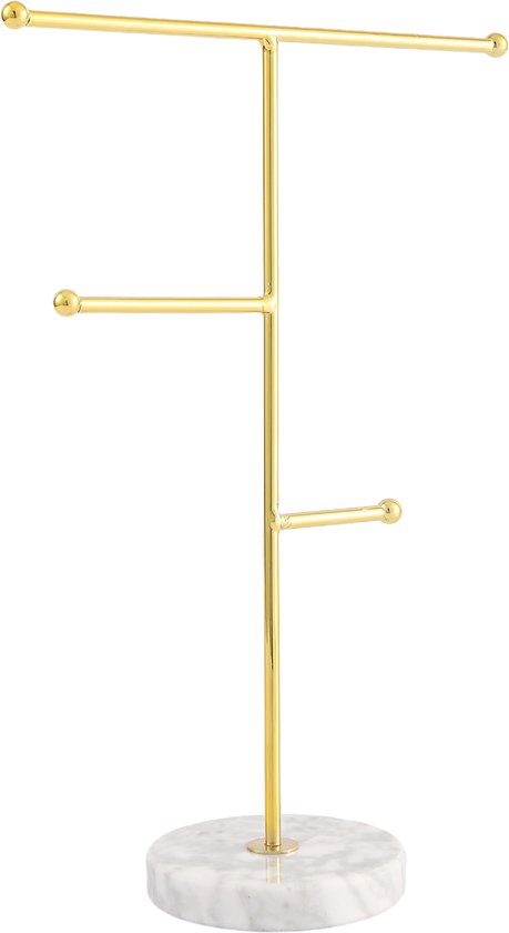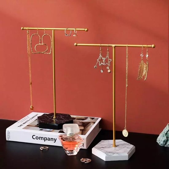 Sieraden display in de kleur goud met marmer look ondersteun. Dit rekje is geschikt voor het presenteren en opbergen van oorbellen en kettingen. Gemakkelijk om in elkaar te zetten.