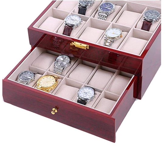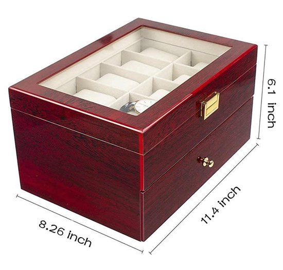 Stijlvolle horlogedoos in roodhouten kleur. De doos heeft 2 lagen en is geschikt voor het opbergen van 20 horloges.