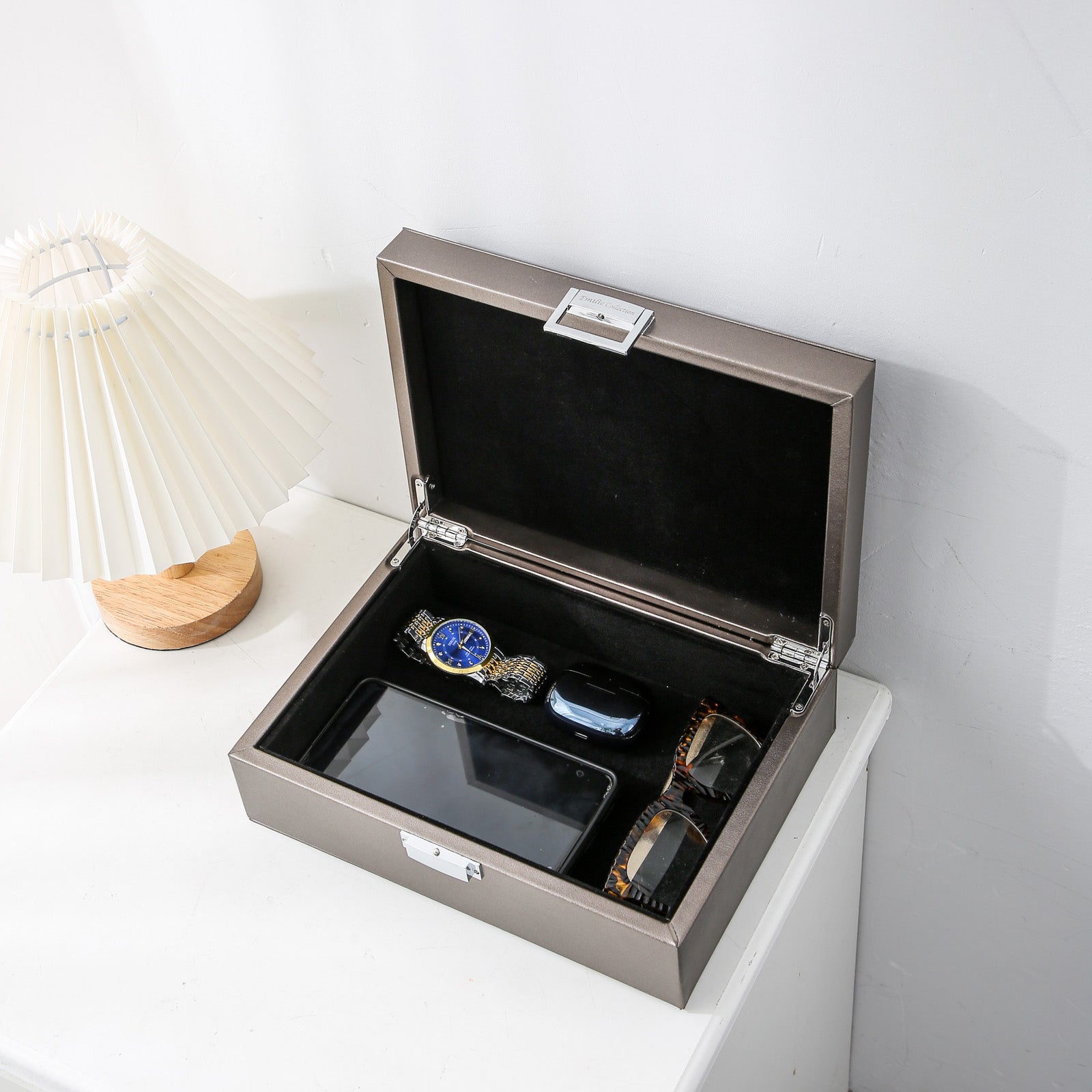 Opbergbox van Emilie collection voor het overzichtelijk opbergen van sieraden en accessoires. Deze opbergdozen zijn ideaal om sieraden en accessoires, zoals afstandbedieningen van de tv, autosleutels en brillen ui het zicht te bewaren.