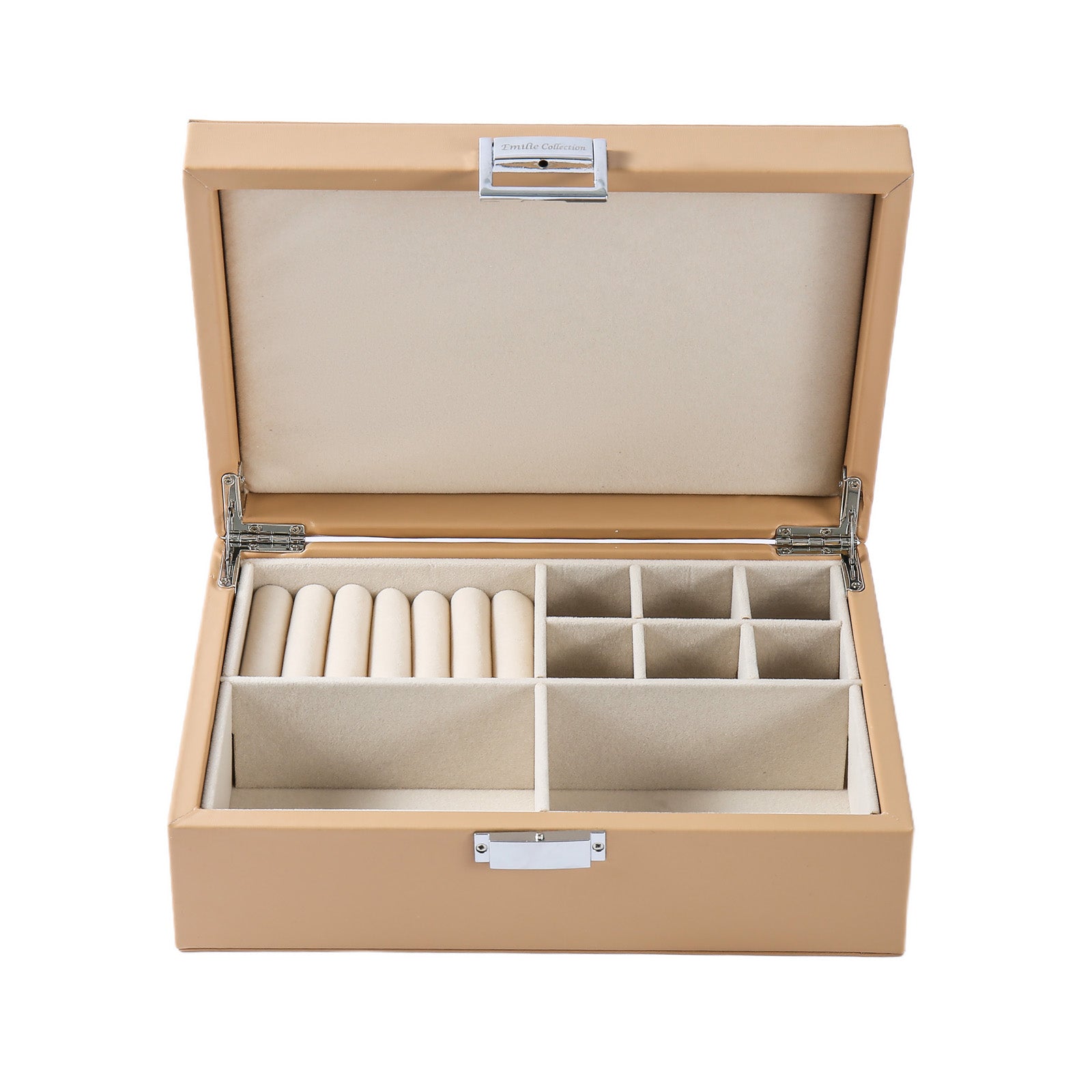 De sieradendoos is gemaakt van beige imitatatieleer en een zachte beigekleurige velours voering.