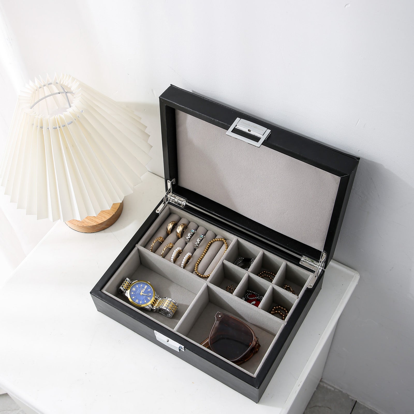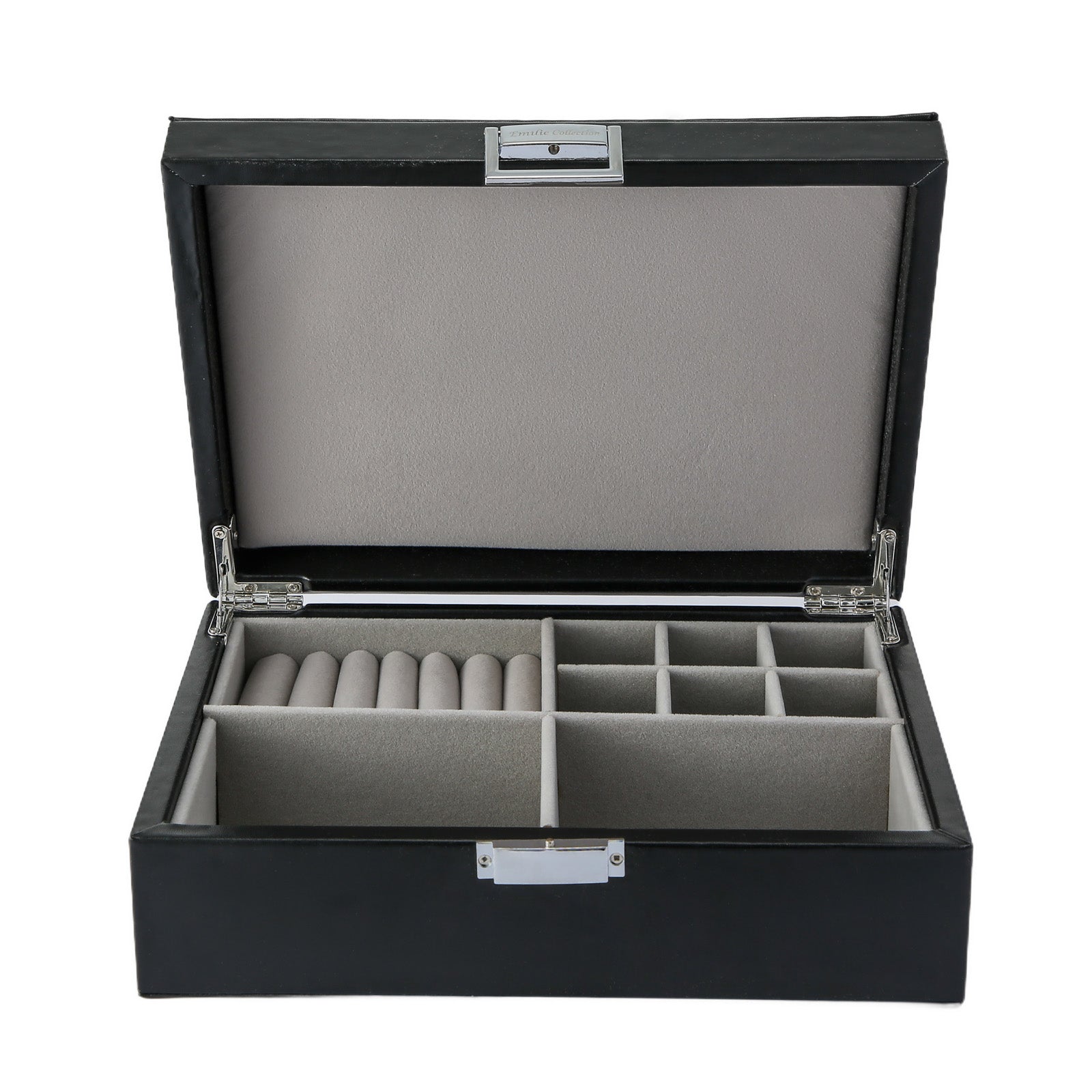 De sieradendoos is gemaakt van klassiek zwart imitatatieleer en een zachte grijskleurige velours voering.